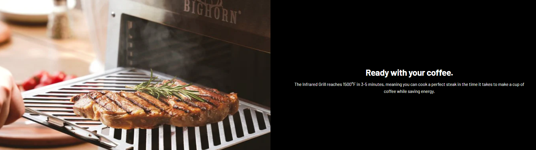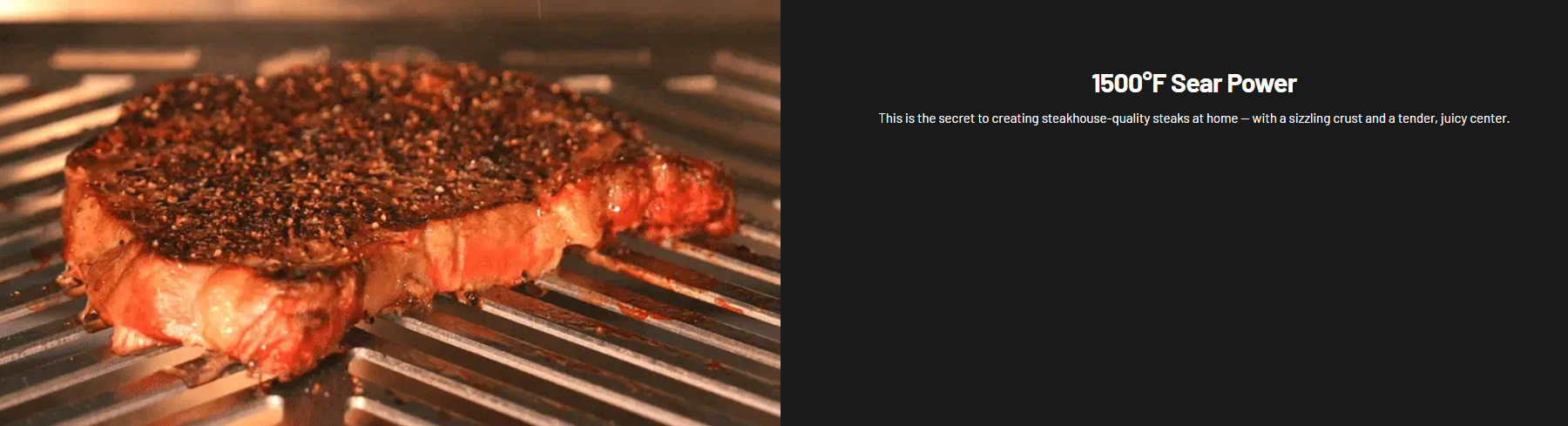 The infrared burner reaches 1500℉ in 3–5 minutes, with 19,000 BTU power and constant cyclic heating, delivering intense, even heat that sears steaks quickly and locks in juices. Achieve a perfectly cooked steak in as little as 5 minutes, while saving energy.