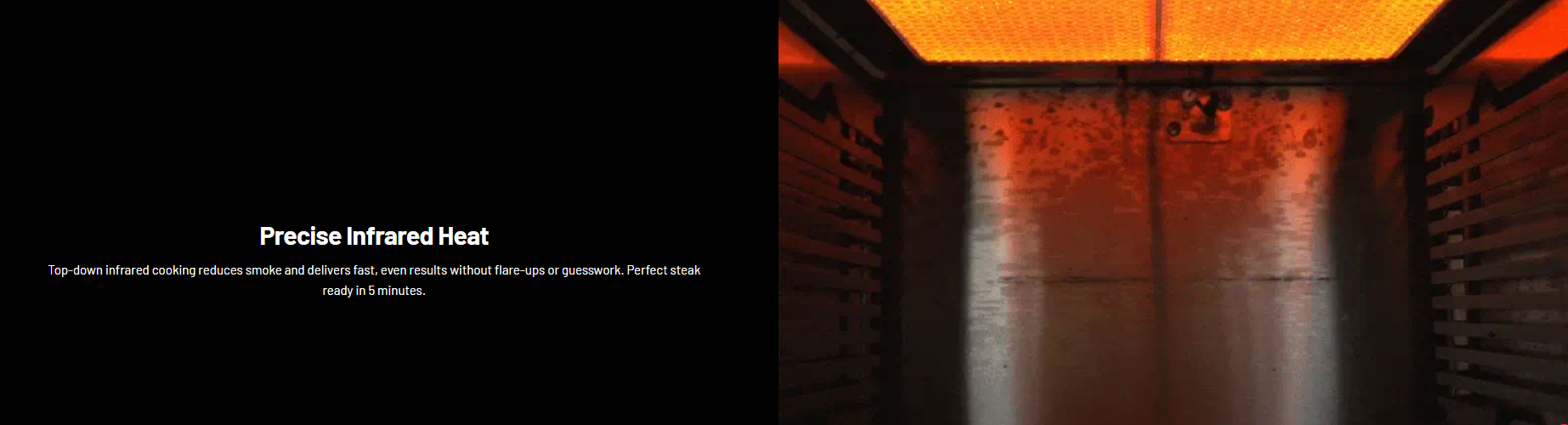 Grill restaurant-quality steak at home with a sizzling crust and tender, juicy center. Top-down infrared cooking (restaurant-style salamanders) delivers fast, even results with no flare-ups or guesswork.