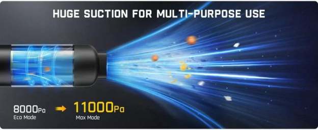 Powerful Suction - High-speed brushless motor provides strong suction of 30AW/12kPa to easily pick up stubborn sand, dust and debris. Two-gear suction adjustment, low gear can be used for 𝟑𝟎 𝐦𝐢𝐧𝐮𝐭𝐞𝐬, high gear can be used for 𝟭𝟮 𝐦𝐢𝐧𝐮𝐭𝐞𝐬