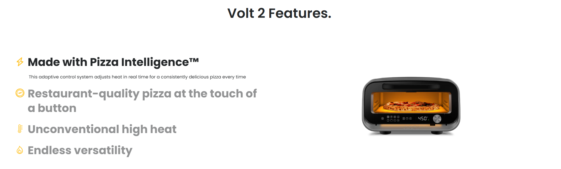 Volt 2 reaches temperatures your home oven could only dream about. Ready to cook restaurant-quality pizza in just 12 minutes, at the same high temperatures that professional pizza chefs use, letting you make perfectly leopard-spotted Neapolitan pizza at home.