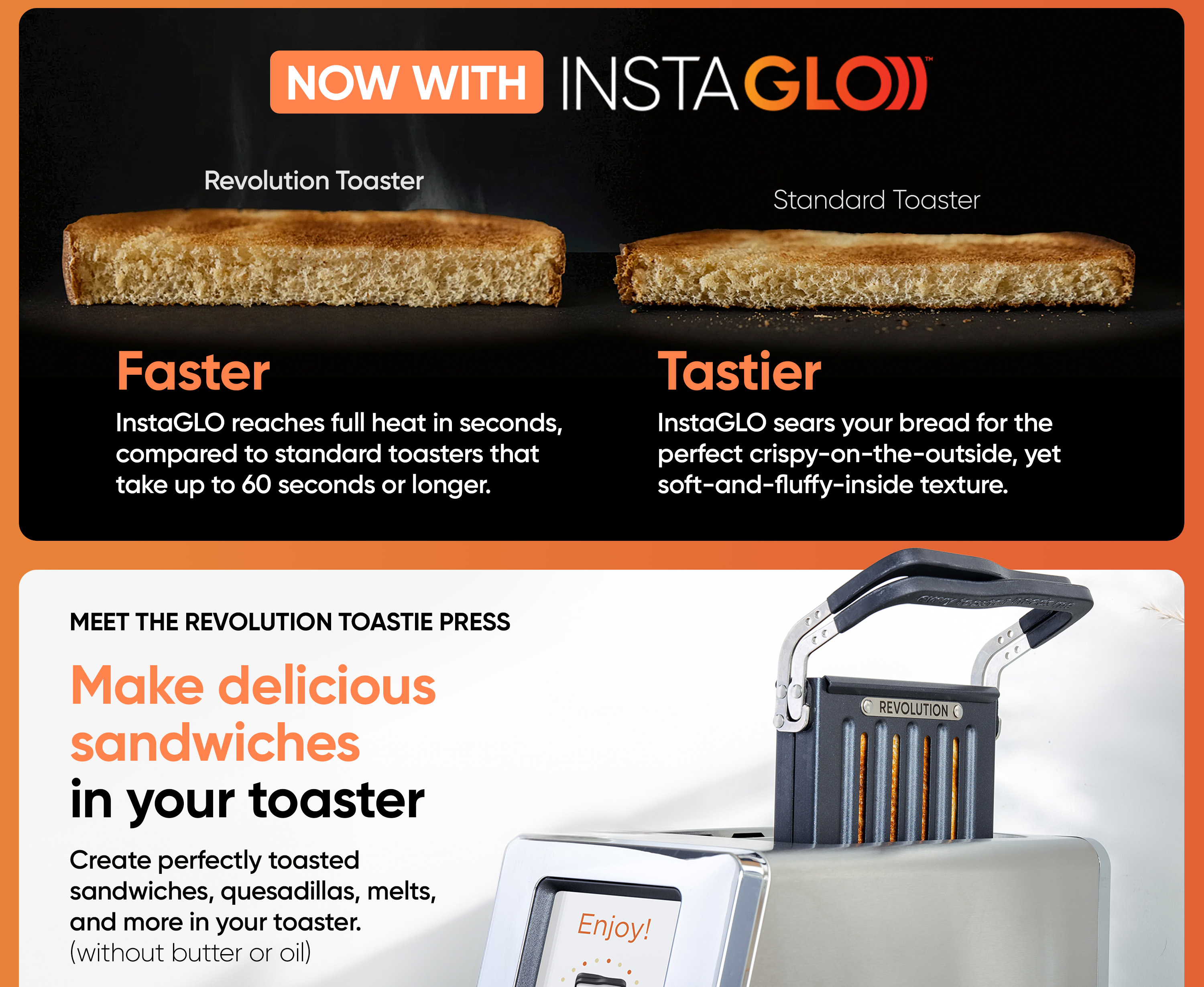 FASTER & TASTIER – New InstaGLO 2.0 is the only heating technology that reaches full heat in just 2 seconds. It sears the outside to lock in flavor and prevent drying out. Your bread will get crispy on the outside, yet stay soft and delicious on the inside. It’s like searing a steak, but for bread.