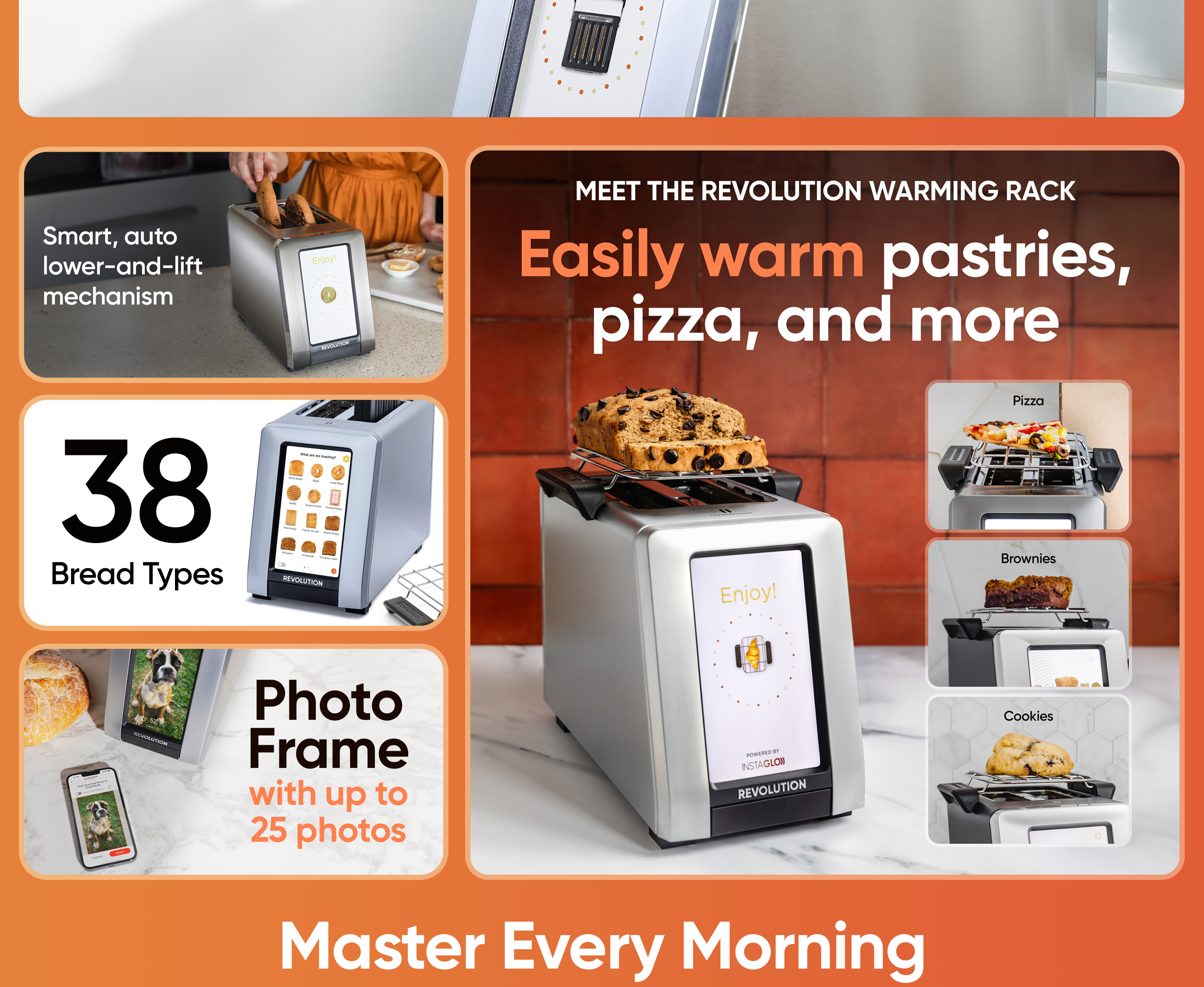 MORE POSSIBILITIES WITH PLUS – The R180 Connect Plus unlocks toasting algorithms for 38 bread types, including a dedicated Gluten‑Free mode and Warming Rack mode. The built-in digital photo frame displays up to 25 of your favorite images, making it a statement piece even when not in use.