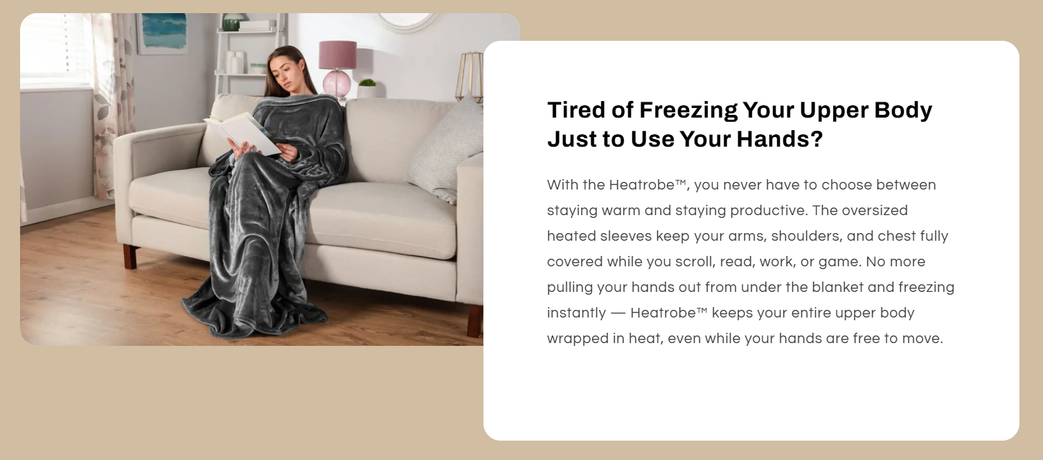 nstead of choosing between staying warm or scrolling your phone, reading, gaming, or working on your laptop, Heatrobe wraps your whole body in heat while your arms stay free. The oversized, ultra-soft heated robe surrounds your shoulders, chest, legs, and feet in consistent warmth, so you feel cocooned like you’re being held, not just covered by a thin throw, It’s like slipping into a cloud if clouds were heated and ridiculously comfortable.
